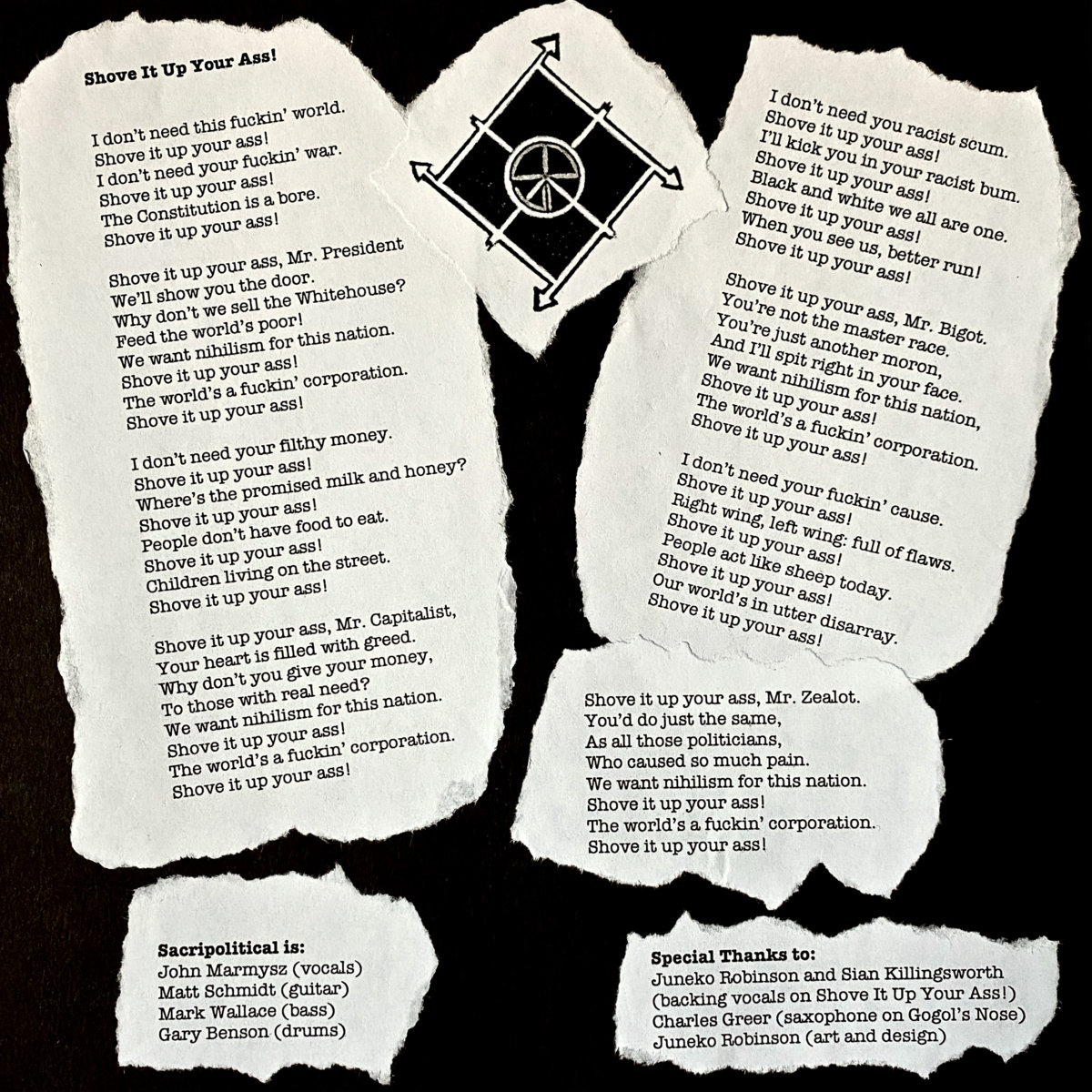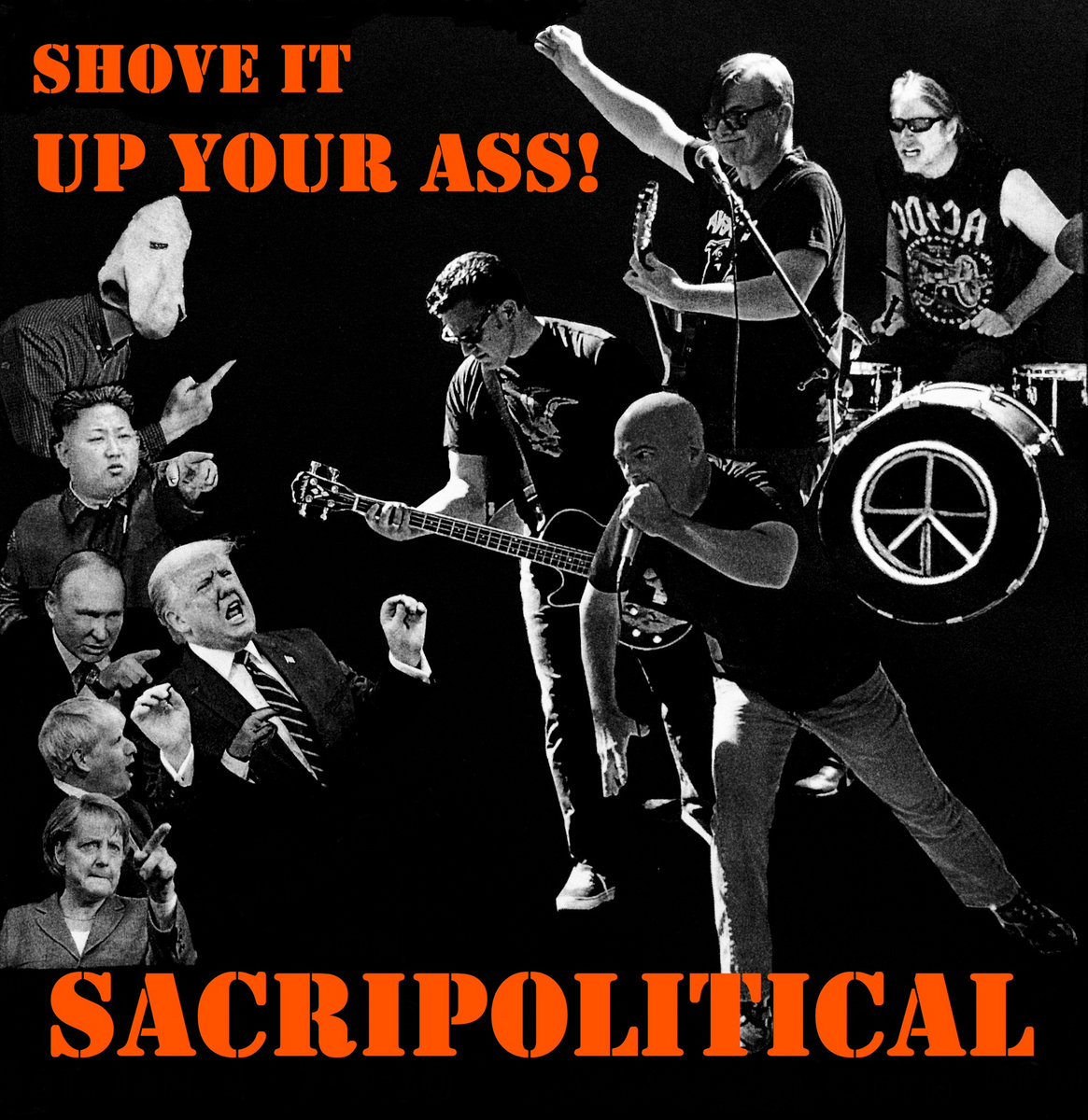 The name Sacripolitical refers to the band members’ attitude toward politics. Just as a person who is sacrilegious is irreverent toward the sacred, Sacripolitical plays songs, like “Peace: Under our Supervision,” “The Nihilist Void,” and “Napalm Baby,” that are politically and philosophically irreverent.